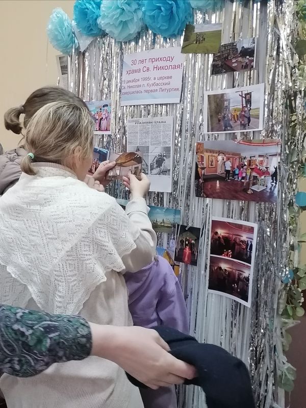 Библиотекарь Марина Петайкина приготовила для всех нас невероятный подарок — живую историю прихода. Она организовала выставку редких фотографий, которые перенесли нас на три десятилетия назад. На них было запечатлено, как водружают купол, статью в газете «Заря» про рождение храма и общины, фото первого настоятеля.