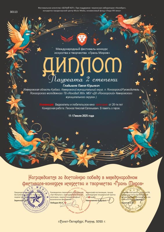 – Всё это был не совсем ожиданно, хотя я и оформлял конкурсную заявку в адрес Всероссийского открытого фестиваля «Код творчества», который проходил сразу в нескольких городах, сделал ссылку на фильм, и отправил её в комиссию конкурса. Через два-три месяца пришли результаты. Я получил Диплом лауреата первой степени конкурса «Код творчества» и ещё три диплома лауреата второй степени: конкурсов «Грань миров», «Палитра талантов» и «Ярче всех». Думаю, мы будем и дальше продолжать своё участие в конкурсах самого разного уровня. В любой деятельности это всегда стимулирует развитие.