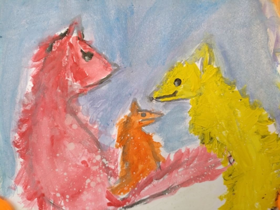 Гуляла как-то семья – папа и мама лисы по заснеженному лесу. Они были очень красивые! У Лиса шёрстка ярко-жёлтая, искрящаяся на солнце, а у Лисички - пламенно-алая, обжигающая. Лисы очень дополняли друг друга. Краше их во всём лесу не было зверьков!