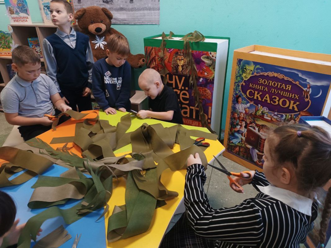 Ребята просмотрели презентацию и научились изготавливать ленты для маскировочных сетей, которые после плетения отправятся на зону СВО.