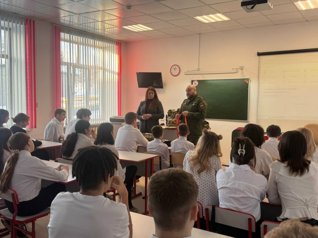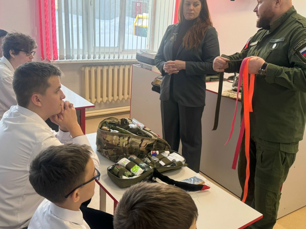 Владимир поделился со школьниками личным боевым опытом, рассказал об основах самопомощи на поле боя, показал способы остановки массивного кровотечения и объяснил действия при ранении до момента эвакуации. Это был не просто рассказ, а живой урок выживания и мужества, который заставляет задуматься о ценности каждой жизни.