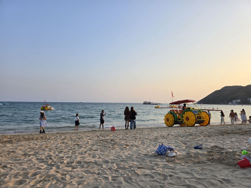 Честно признаюсь, что я очень люблю море. Поэтому каждый день в отпуске я стараюсь бывать на море несколько раз. Разница по времени Кемерово с Китаем составляет один час. Утром я собирала рюкзак, брала фрукты, воду и отправлялась на пляж. По пути я заходила в кафе на завтрак. Вода в море теплая, так что легко можно было плавать буквально по часу. Так как в Китае беспокоятся о безопасности, то плавать можно только в специально огороженных местах – русские туристы называют их загонами. Рядом – будка со спасателем, который свистит, если кто-то подплывает под буйки или заходит в воду вне загона. Второй спасатель на сапборде караулит с моря, готовый прийти на помощь. Большая часть китайских туристов предпочитает или вообще не заходить в воду, или плавать около берега, при этом используя круги или нарукавники. Те же, кто умеет плавать, предпочитает плавать от одного края загона к другому - как на тренировке в бассейне.