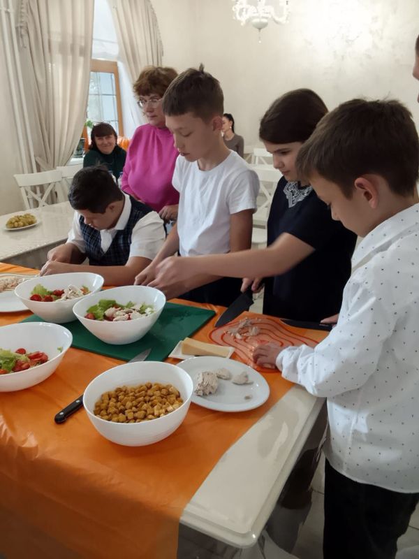 Семьи провели день, наполненный ароматами, смехом и настоящим домашним теплом. Вместе готовили любимые блюда: салат «Цезарь», нежное картофельное пюре, сочные куриные шашлычки и особое угощение — голубое мороженое. Каждый старался, помогал соседу, делился секретами и просто радовался тому, что рядом — свои.