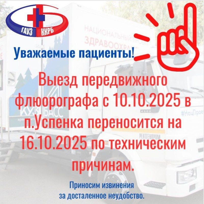 Кемеровская клиническая районная больница сообщает, что выезд передвижного флюорографа с 10.10.2025 в п. Успенка переносится на 16.10.2025.