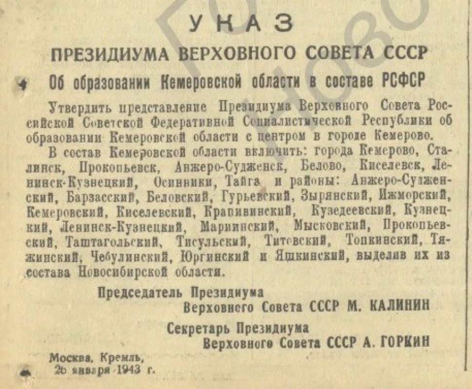 Сам «Указ президиума верховного совета СССР об образовании Кемеровской области в составе РСФСР» в газете был опубликован только через неделю в № 9 от 3 февраля 1943 года, на первой полосе. Центром стал город Кемерово, в состав также вошли Сталинск, ныне Новокузнецк, Прокопьевск, Анжеро-Судженск, Белово, Киселевск, Ленинск-Кузнецкий, Осинники, Тайга и многие районы, которые выделили из состава Новосибирской области.