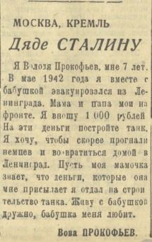 В выпуске № 8 от 27 января 1943 года на первой полосе самым запоминающимся материалом стало письмо от Вовы Прокофьева «Дяде Сталину». В нем он рассказала, что в мае 1942 года эвакуировался с бабушкой из Ленинграда, а родители ушли на фронт. И его заветное желание - это «скорее прогнать немцев и возвратиться домой в Ленинград». Вова 1000 рублей, которые ему присылала мама, внёс на строительство танка. В конце письма мальчик пишет: «Живу с бабушкой дружно, бабушка меня любит».