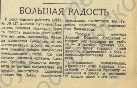 На третьей полосе того же номера вышла заметка, наполненная гордостью и благодарностью, «Большая радость». В ней рассказали, что Алексею Кузьмичу Солдатову с фронта пришла весть о том, что его дочь Матрёна «за самоотверженную работу по спасению раненых бойцов, награждена командованием части, где она служит, именным оружием». Отцу также выразили благодарность, которая весела у него дома в рамке. И весь район поздравлял его по этому случаю: «- Героиню дочь воспитал Алексей Кузьмич Солдатов! – говорят ему товарищи по работе. – И Алесей Кузьмич Солдатов по праву гордится своей дочерью, отличавшейся в боях с немецко-фашистскими захватчиками».