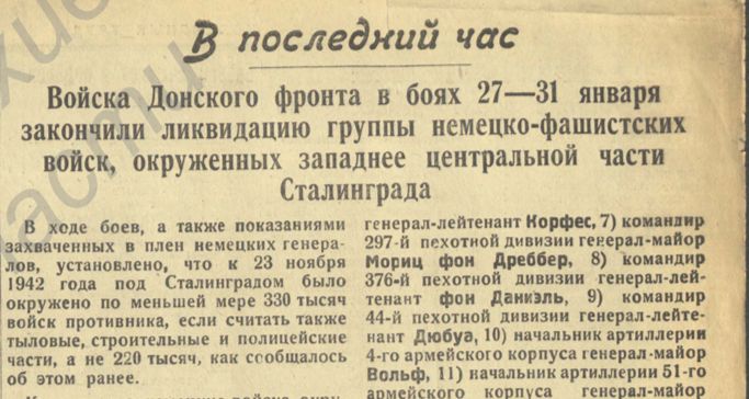 «Войска Донского фронта в боях 27-31 января закончили ликвидацию группы немецко-фашистских войск, окружённых западнее центральной части Сталинграда»;